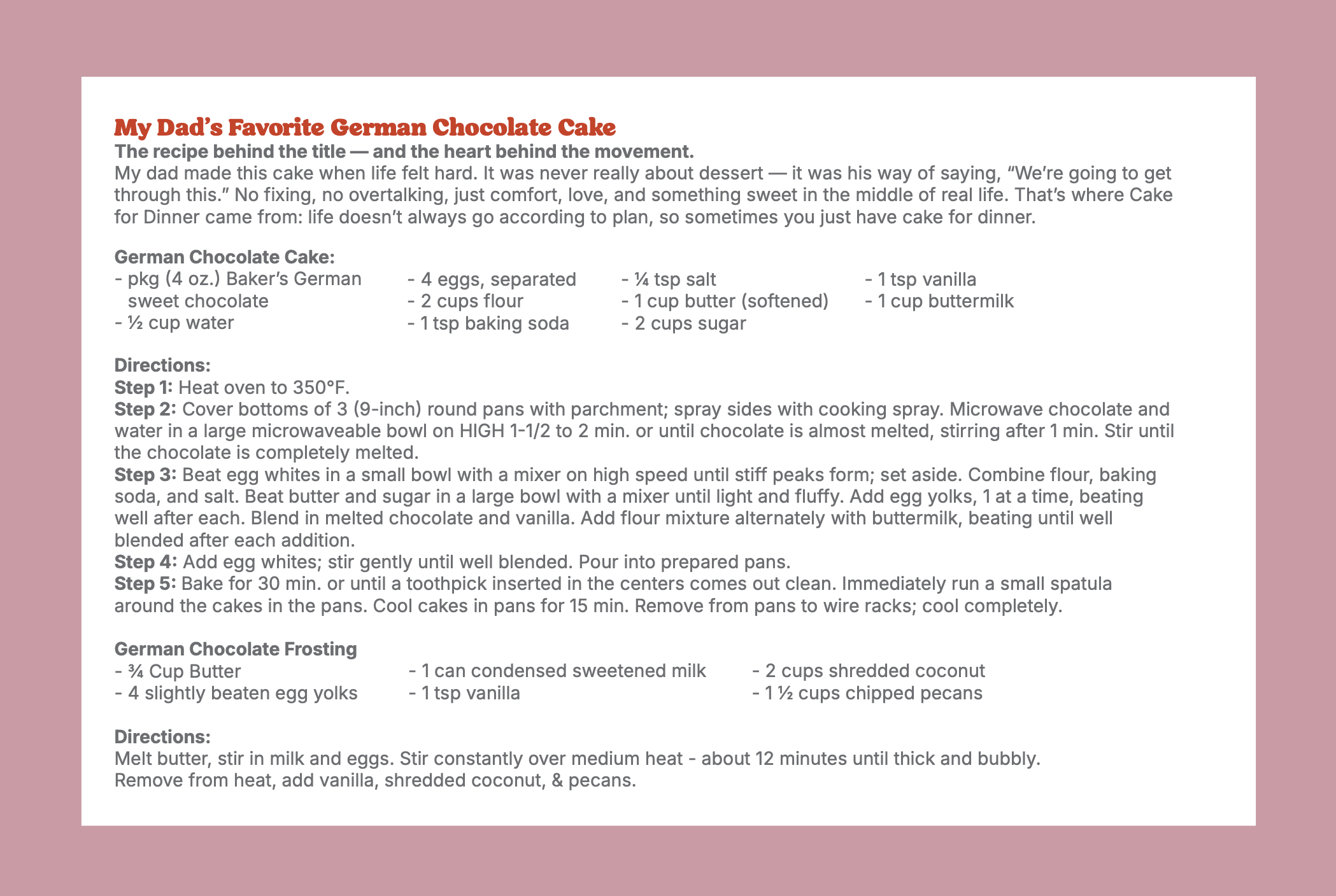 The Cake for Dinner Podcast is a tribute to the “art of the pivot” the moment life falls apart and you choose to keep going anyway. It’s a space that rejects the pressure of perfection and balance, offering instead a “fuck it” philosophy for anyone navigating the unraveling parts of life.